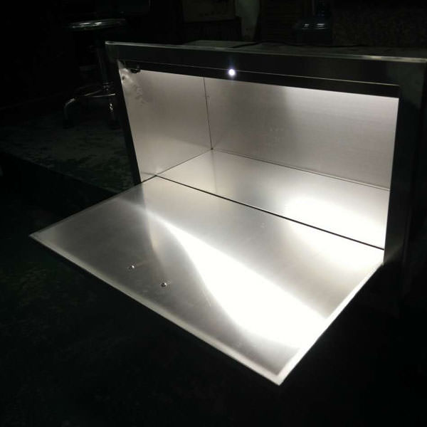 醫用手術室內嵌式書寫臺采用優質全不銹鋼制作而成,臺板內側裝有液壓式拉桿,使用時可打開不銹鋼書寫臺,打開后在臺面上紀錄書寫,內置裝有照明燈,使工作人員工作時更明亮,是國內醫院普遍使用的一種紀錄用具